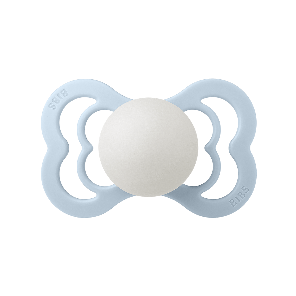The symmetrical flat drop-shaped nipple promotes a tongue placement and sucking technique, where the tongue is flat and presses the pacifier flat against the palate, which means that the baby does not have to suck as hard as with a round pacifier for the pacifier to flatten out inside the mouth.